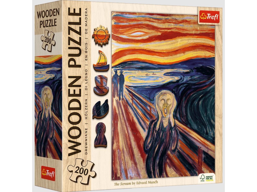 Puzzle - 200 Dřevěných Puzzle - Křik - Trefl 20252 představuje slavný obraz Křik od Edvarda Muncha.
