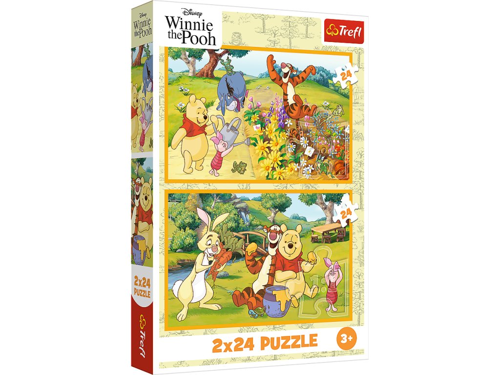 Puzzle - 2x24 - Den na zahradě - Disney Medvídek Pú Trefl 34436 je sada, která obsahuje dvě samostatné skládačky po 24 dílcích v jednom balení.