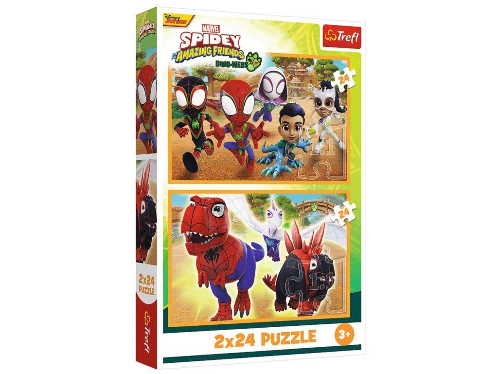 Puzzle 2x24 Spidey a Dinosauři Trefl 34432 nabízí dva různé obrázky, každý s 24 dílky, v jednom balení! Poskládání se stává ještě zajímavější a umožňuje účast více dětí najednou.