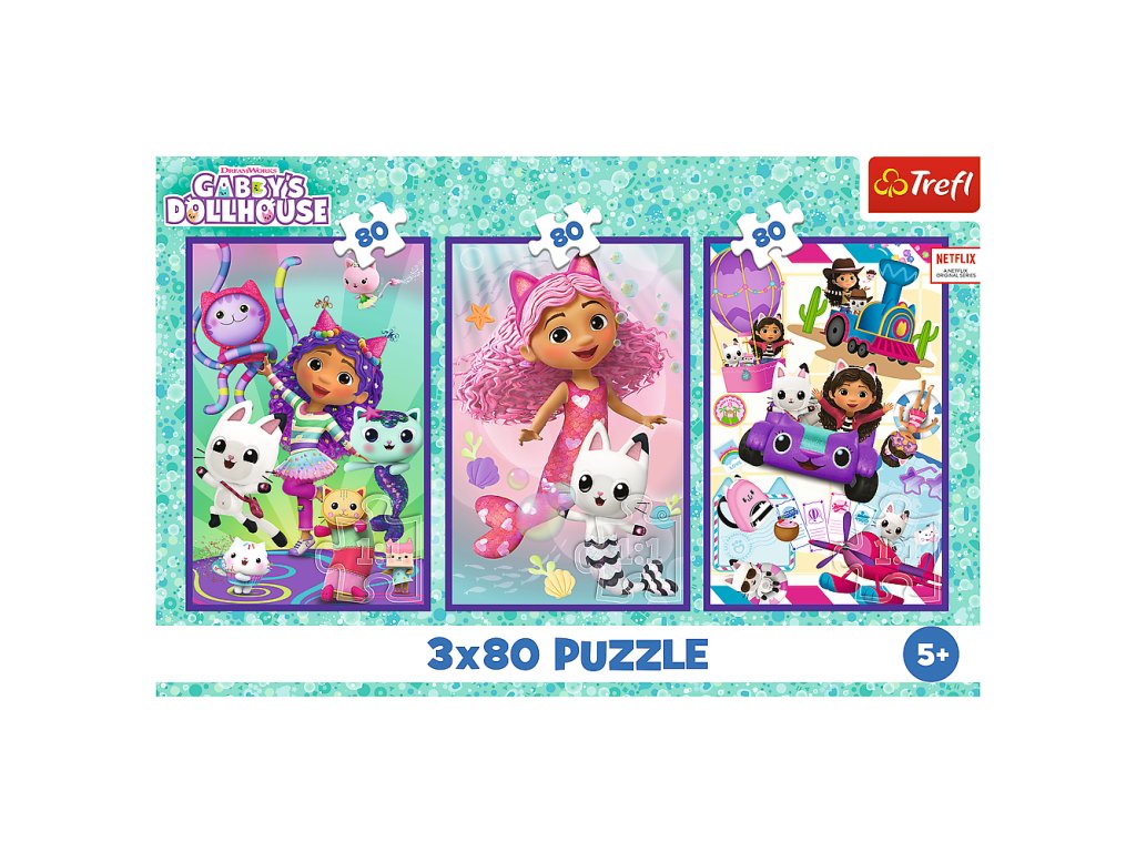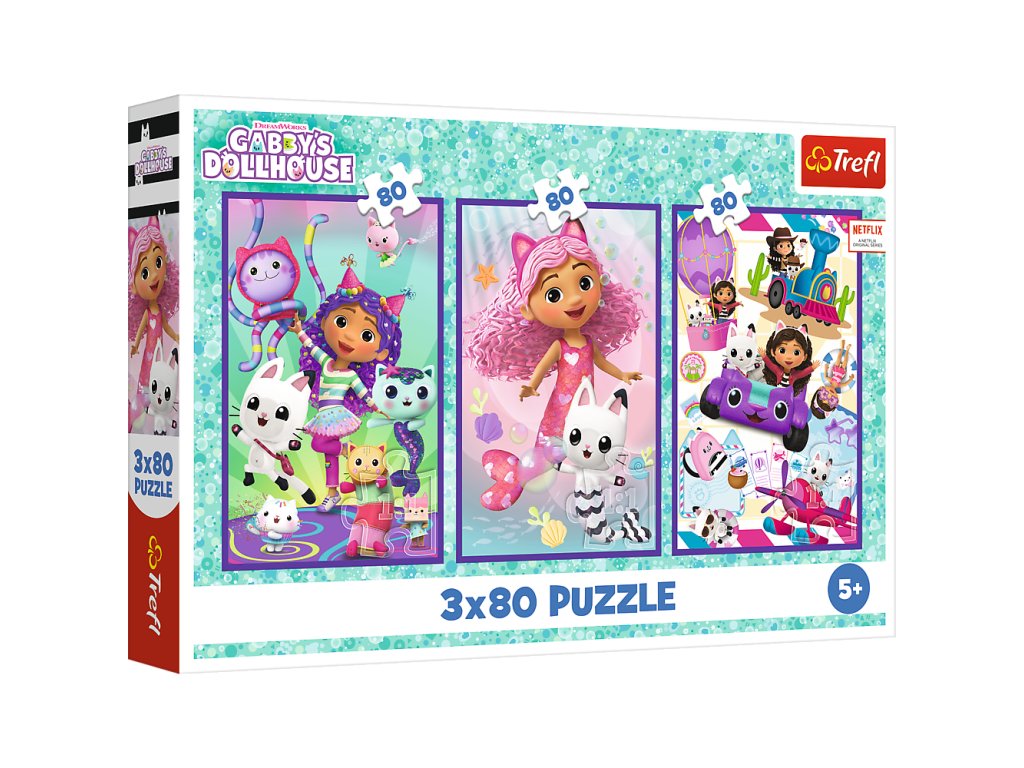 Puzzle 3x80 Barevné dny Gabby Trefl 34882 je sada tří skládaček, každá obsahující 80 dílků, v jednom balení!