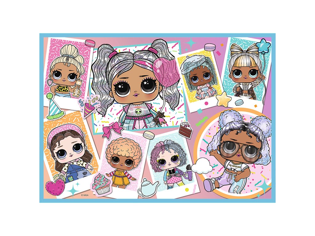 Poznej panenky / MGA LOL Surprise! Trefl 34613 je balení puzzlí pro děti, které obsahuje 4 nezávislé skládanky, vytvořené pro všechny fanoušky panenek LOL Surprise