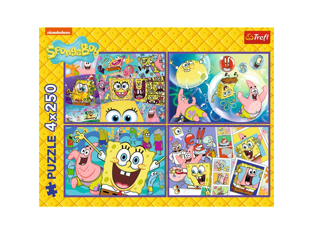 Bláznivý svět SpongeBoba od firmy Trefl nabízí až čtyři skládanky po 250 dílcích v jednom balení! Bláznivý svět SpongeBoba jsou puzzle, které představují dobrodružství postaviček z oblíbeného seriálu SpongeBob Kanciastoporty