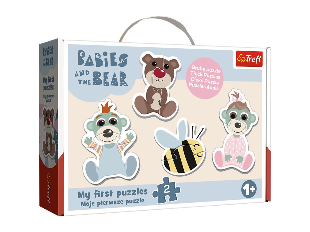 Puzzle - Baby Classic - Přátelští Broučci - Broučci a Medvídek Trefl 36139 obsahuje 4 skládačky, z nichž každá se skládá ze dvou velkých a tlustých dílků, ideálních pro začátek pro děti již od 1 roku života.