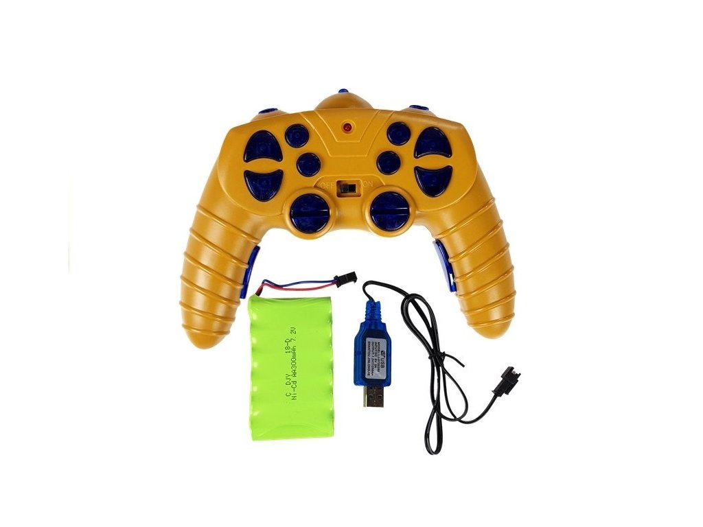 - Dálkově ovládané vozidlo má konstrukci typickou pro masivní stavební stroje a také klasické barevné provedení