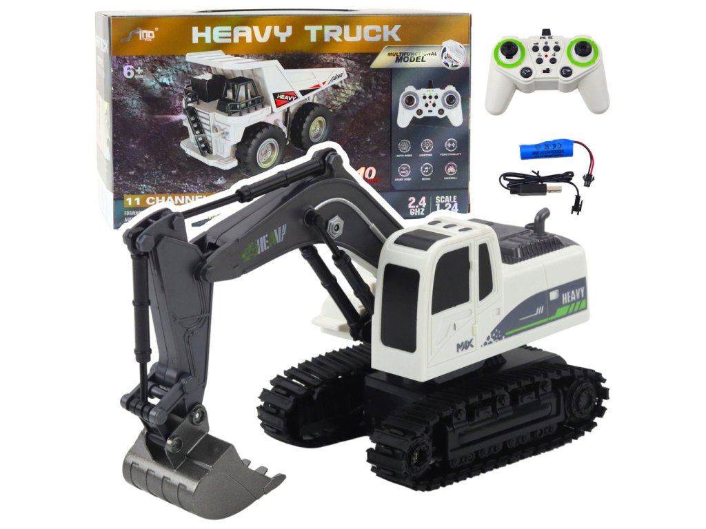 - Obsah balení: Zdalně ovládaný bagr, pilot 2.4 GHz, akumulátor 3.7V, USB kabel pro nabíjení, návod