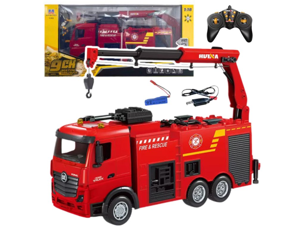 Zdalně ovládané hasičské auto s jeřábem RC Huina 1:18 je ideální model pro milovníky záchranářských vozidel a realistické RC hračky Díky 9-kanálovému ovládání, teleskopickému výsuvnému rameni a funkci postřiku vodou poskytuje vozidlo interaktivní a vzrušující hru, která zajišťuje realistický zážitek z práce hasičů
