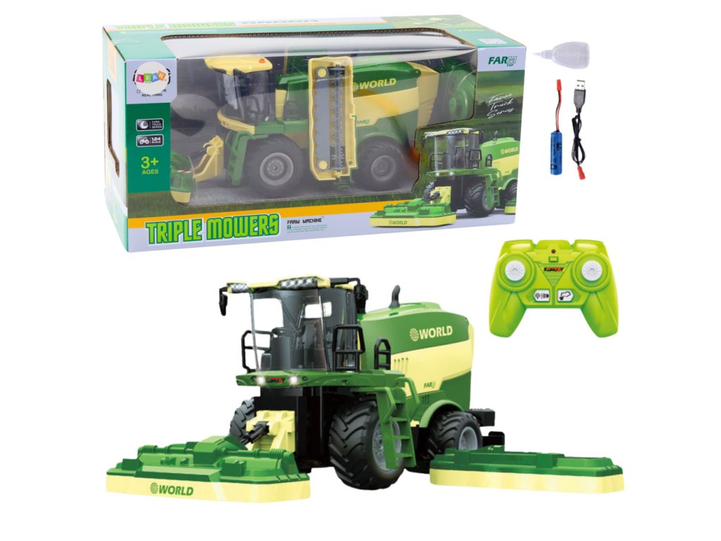 ZVUKOVÉ EFEKTY A EFEKT PÁRY VODY Zcela unikátní zdalně řízený kombajn s rotačními sekáči na trávu je perfektní hračkou pro děti fascinované zemědělskými stroji a prací na farmě Tento model je přesně ztvárněn, což mu dává vzhled skutečného zemědělského vozidla určeného k sečení a sklízení trávy