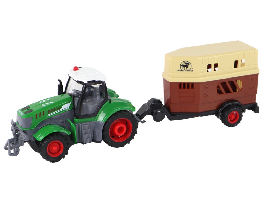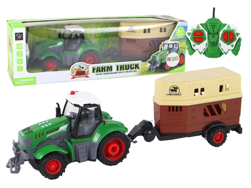 RC traktor, dálkově ovládaná zemědělská strojní přívěs, pilot 1:24 Zemědělský stroj je v zelené barvě s bílými a šedými prvky, které mu dodávají charakteristický vzhled Přívěs pro přepravu zvířat je v odstínech hnědé barvy a je navržen tak, aby pojmul velký počet zvířat, což vybízí k hraní a vymýšlení příběhů