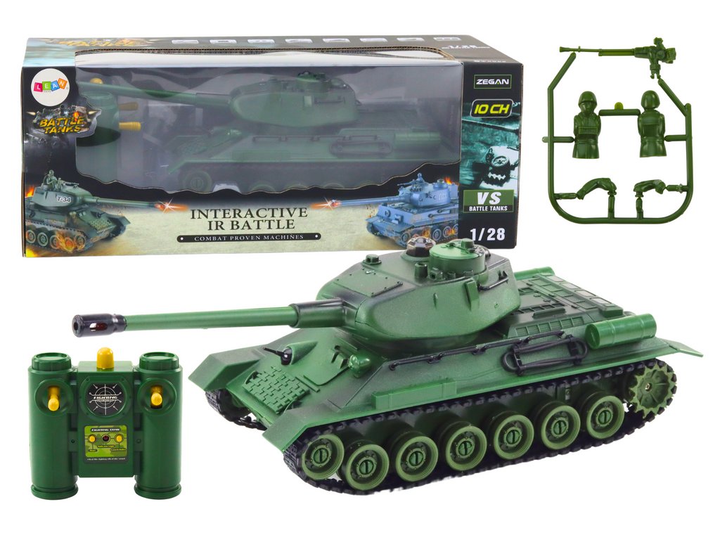 RC Vojenský Tank s Otočnou Věží 1:28 Zelený je zelený dálkově ovládaný vojenský tank, který představuje pokročilou hračku, jež přenáší děti do světa realistických bitev Je vybaven otočnou věží s hlavní se systémem infračerveného záření, což poskytuje vzrušující možnosti interaktivní hry