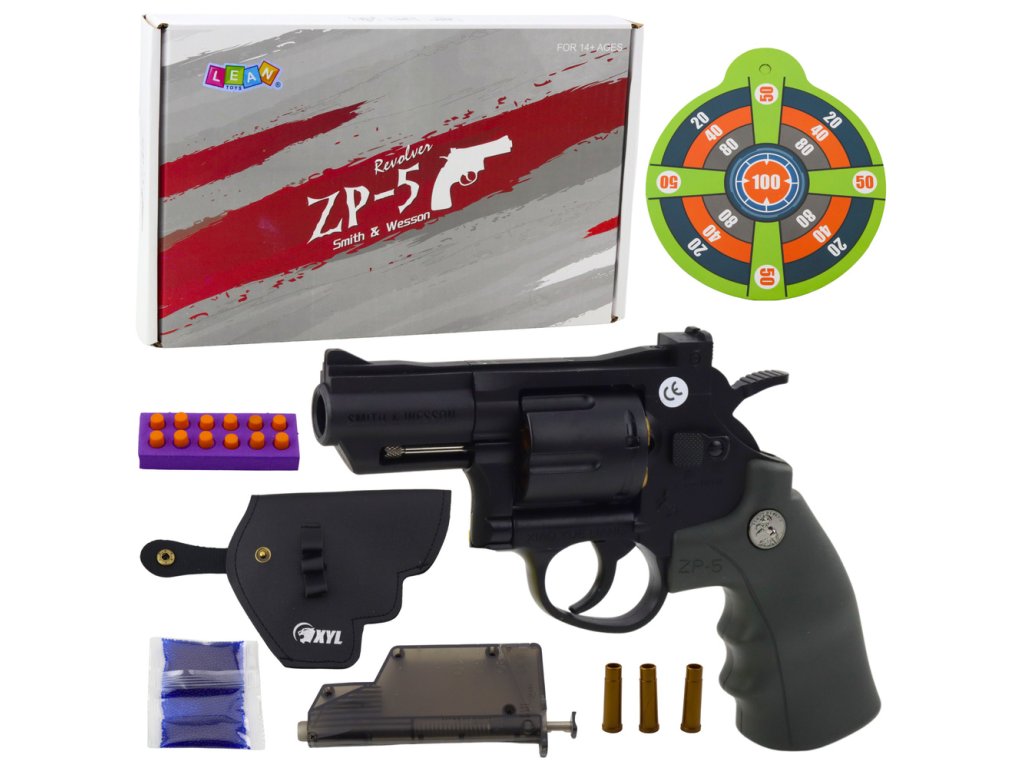 - Revolver ZP-5 na pěnové náboje a vodní gelové kuličky s terčem a pouzdrem představuje výjimečnou střílecí sadu vytvořenou pro starší děti a mládež
