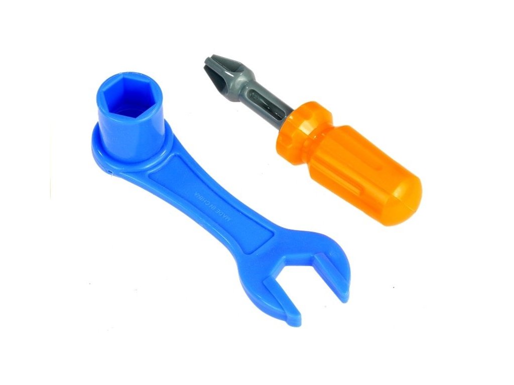 - Nastavitelný klíč a šroubovák s vyměnitelnou špičkou jsou ideálně přizpůsobeny rozměrům plastových šroubů, kterými jsou připevněna kolečka nebo nárazníky hračky