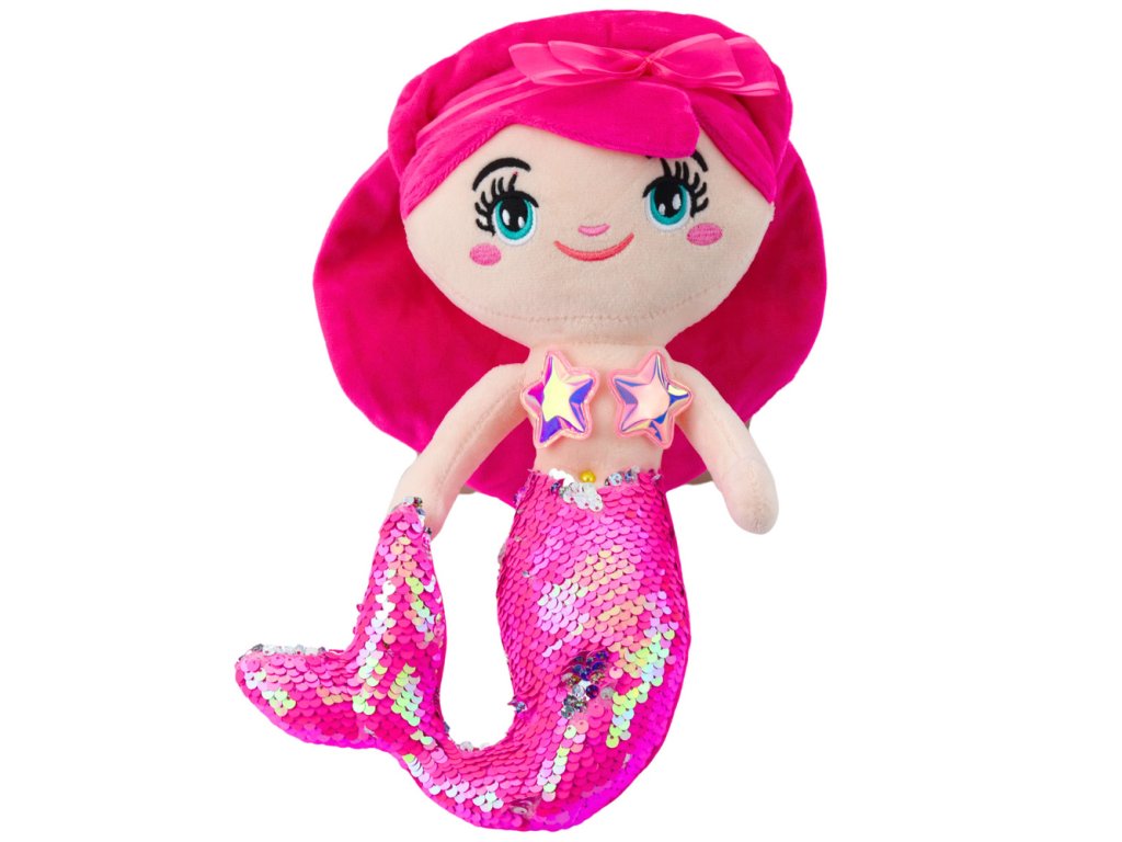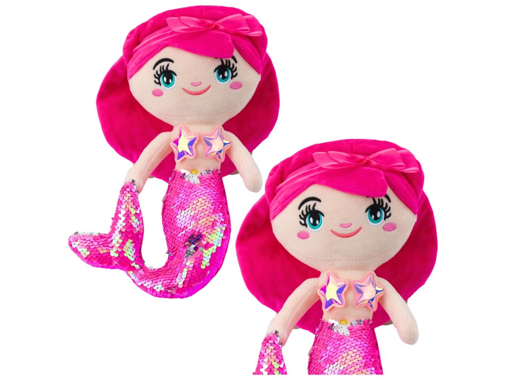 - Růžová Plyšová Mořská Panna s Flitrovým Ocasem 30 cm je rozkošná hračka, která okouzlí každé dítě svým vzhledem a magickým efektem změny barvy flitrů