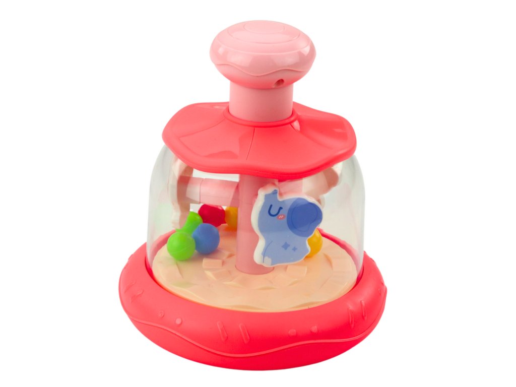 - Po stisknutí růžového tlačítka na vrcholu se kolotoč uvede do pohybu, a zvířátka se začnou otáčet kolem své osy, čímž vytváří dynamický, barevný kolotoč