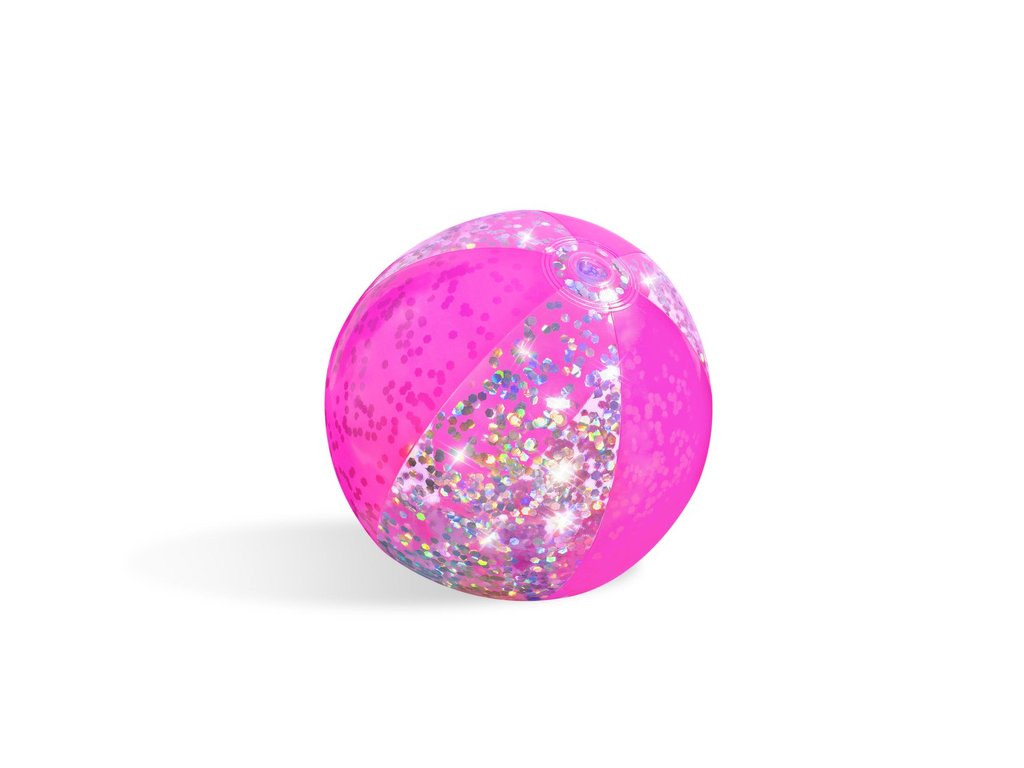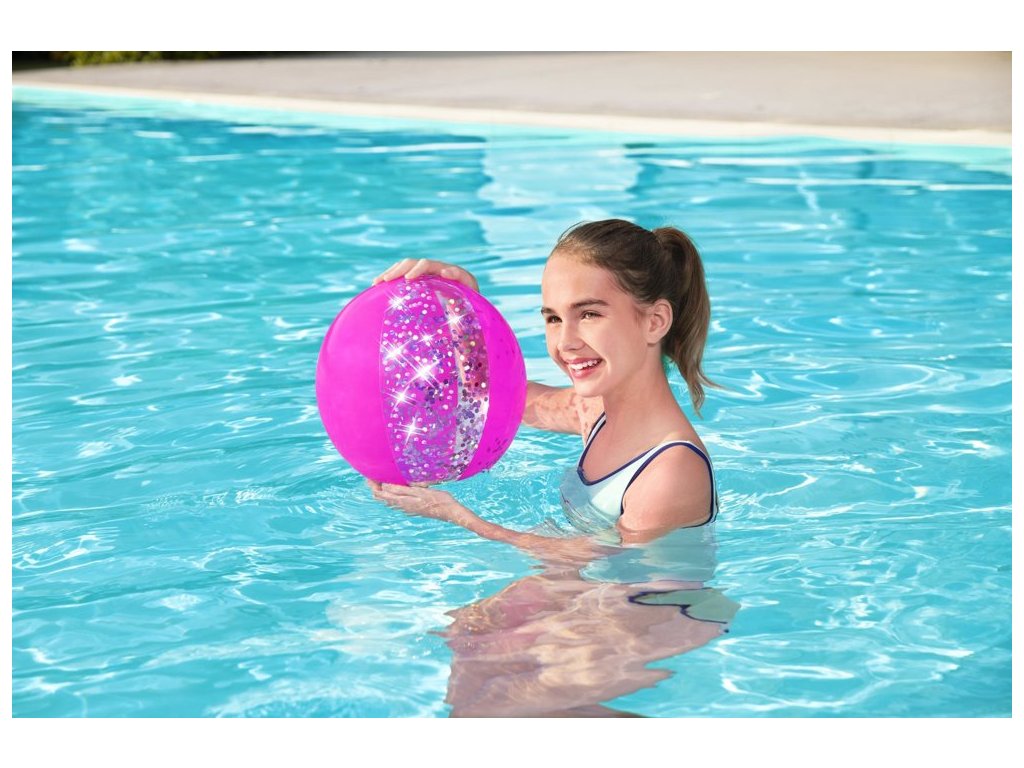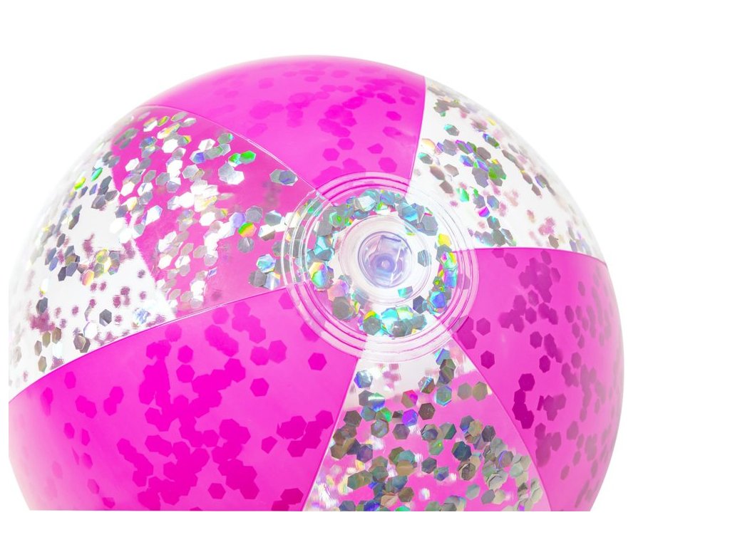Růžový třpytivý plážový míč 41 cm Bestway 31050 je ideální hračkou pro zábavu na pláži i ve vodě. Díky průměru 41 cm a třpytkám uvnitř je skvělou volbou pro děti, které si tak užijí zábavu a budete mít vždy dokonalý přehled o pozici míče. Míč je vyroben z odolného a pevného vinylu, což mu poskytuje vysokou odolnost proti poškození. Díky ventilu lze míč snadno a rychle nafouknout a brání úniku vzduchu. Když je potřeba míč uskladnit, vzduch lze rychle vypustit, takže nezabere mnoho místa.