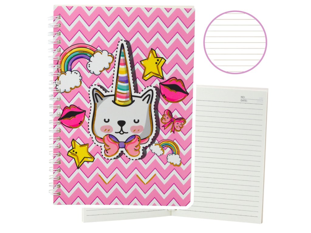 - Speciální růžový zápisník s motivem roztomilého kočičího jednorožce, který jistě splní všechna očekávání dětí, které mají rády veselé a barevné doplňky