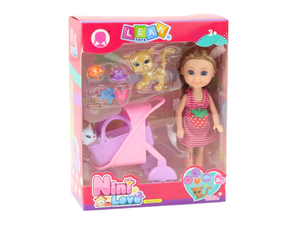 Sada: Mini Panenka s Kočárkem a Koťaty je skvělým dárkem pro děti, které milují tematické hry a péči o zvířátka Tento set obsahuje panenku s dlouhými blond vlasy spletenými do copánků, oblečenou v růžových pruhovaných šatech a růžových botách