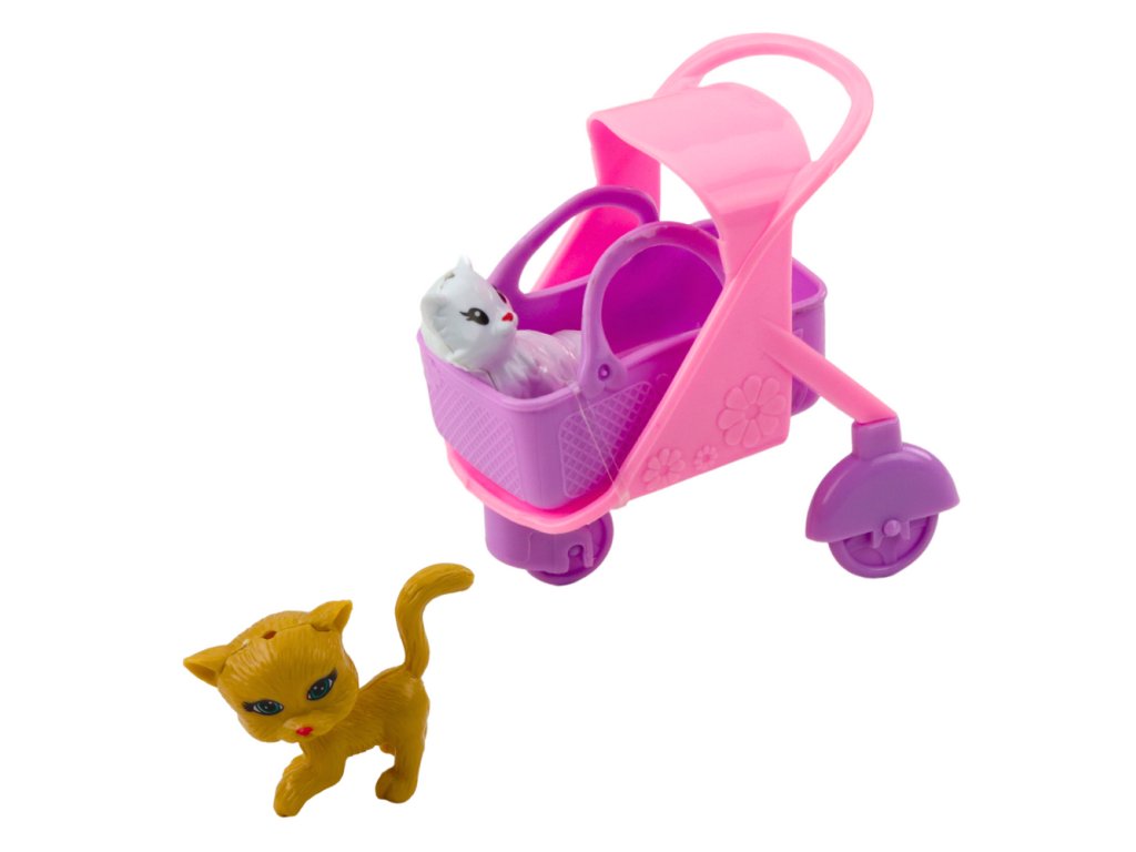 Součástí sady je také růžovo-fialový kočárek určený pro přepravu dvou roztomilých koťátek jednoho bílého a druhého hnědého