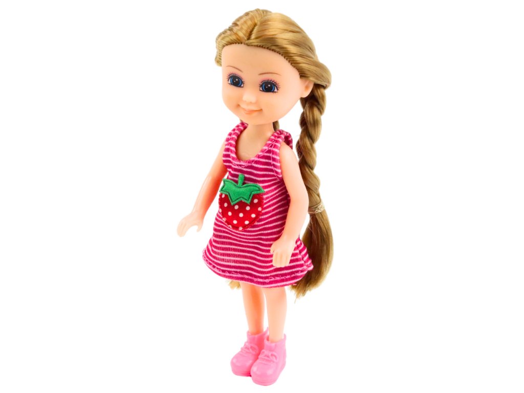 - Mini panenka s dlouhými blond vlasy v copánkách, oděná v stylových pruhovaných šatech a růžových botičkách
