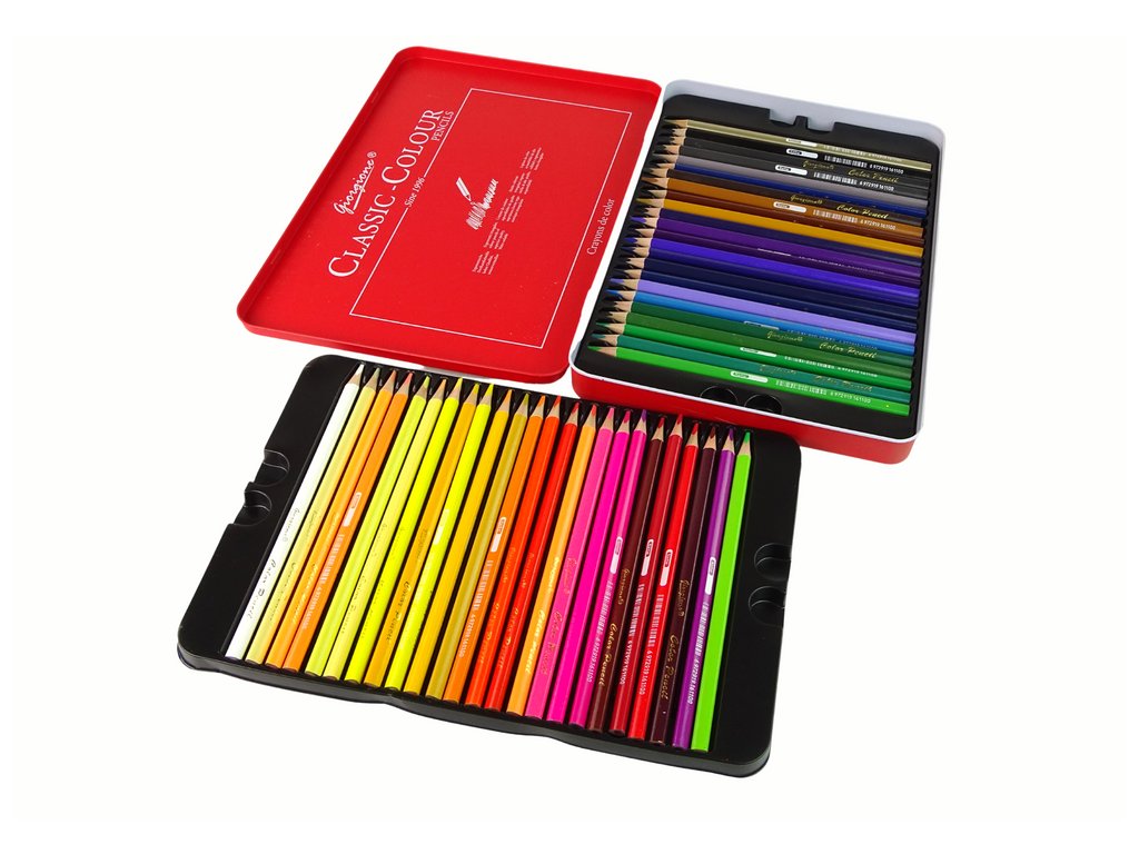 - Pastelky jsou uloženy v pevném kovovém pouzdře se 2 patry v červené barvě