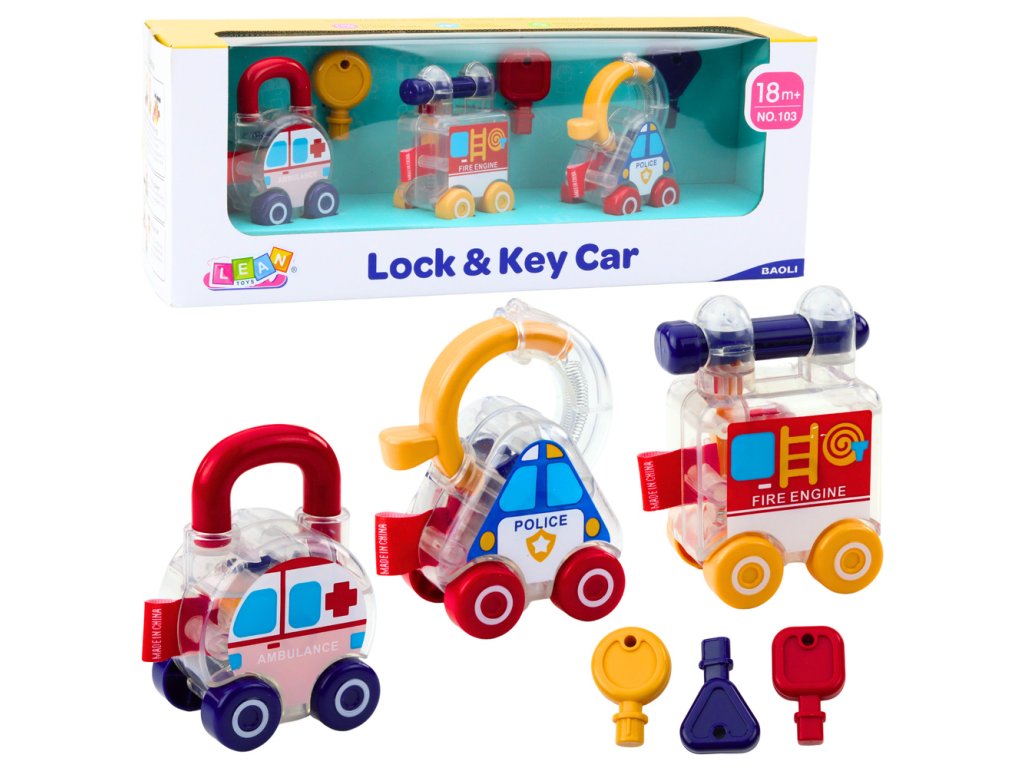 ambulanci, hasičský vůz a policejní auto z nichž každé je uzavřeno speciálním zámkem, který lze otevřít pomocí příslušného klíče