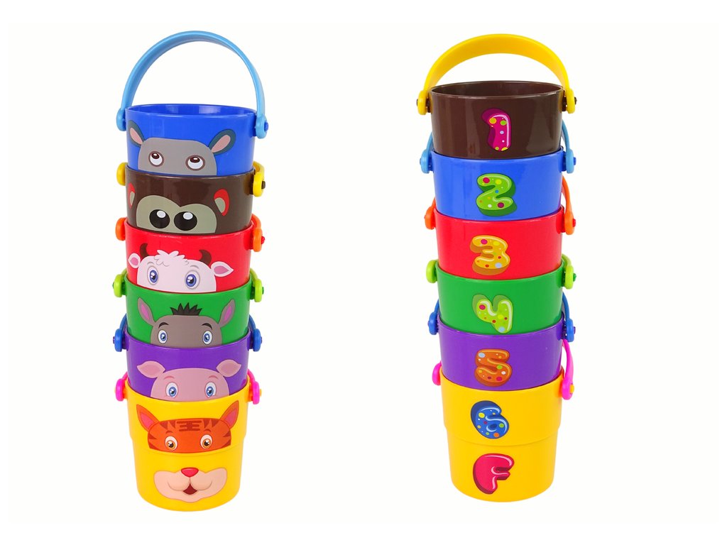 - Sada barevných kbelíků se zvířátky a pyramidou Barevná kbelíky jsou ideální hračka do vany pro nejmenší děti
