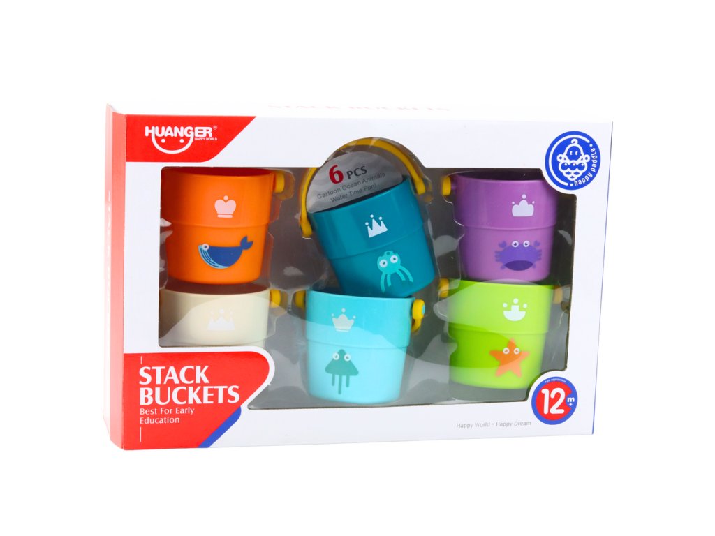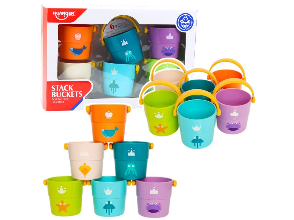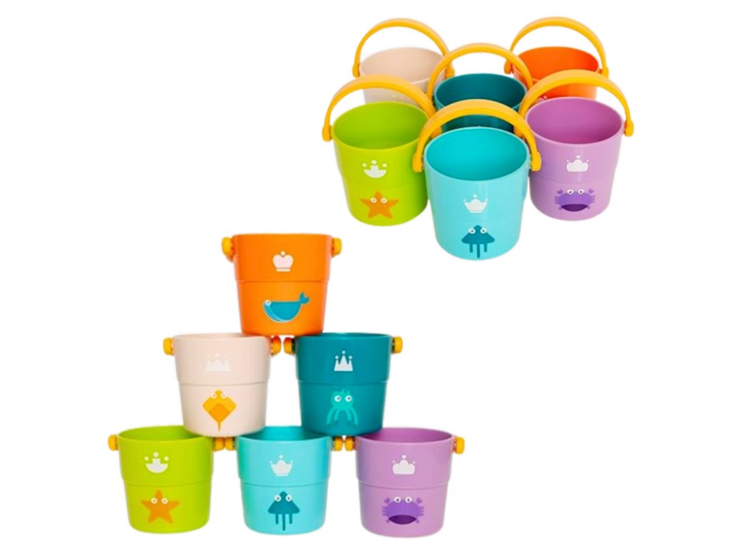 - Souprava se skládá z 6 lehkých, barevných kyblíků zdobených námořními motivy, které lze stohovat nebo se s nimi hrát během koupele