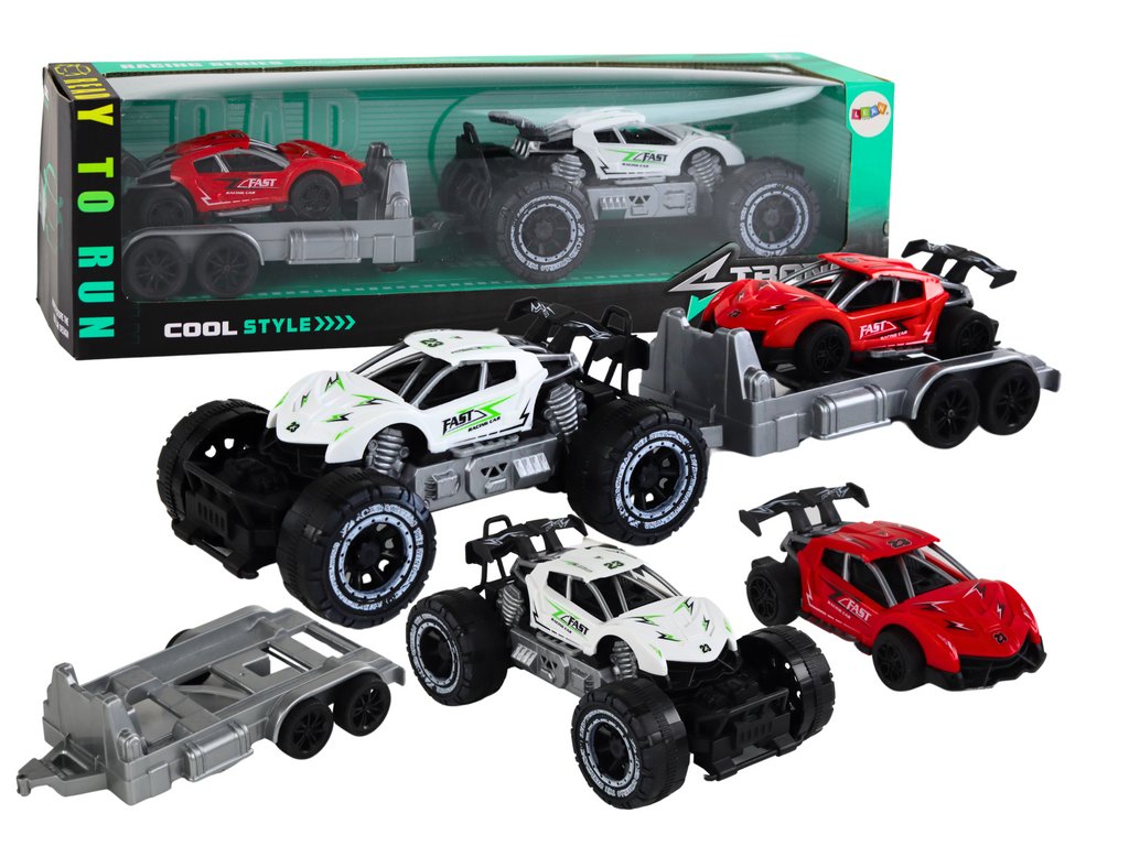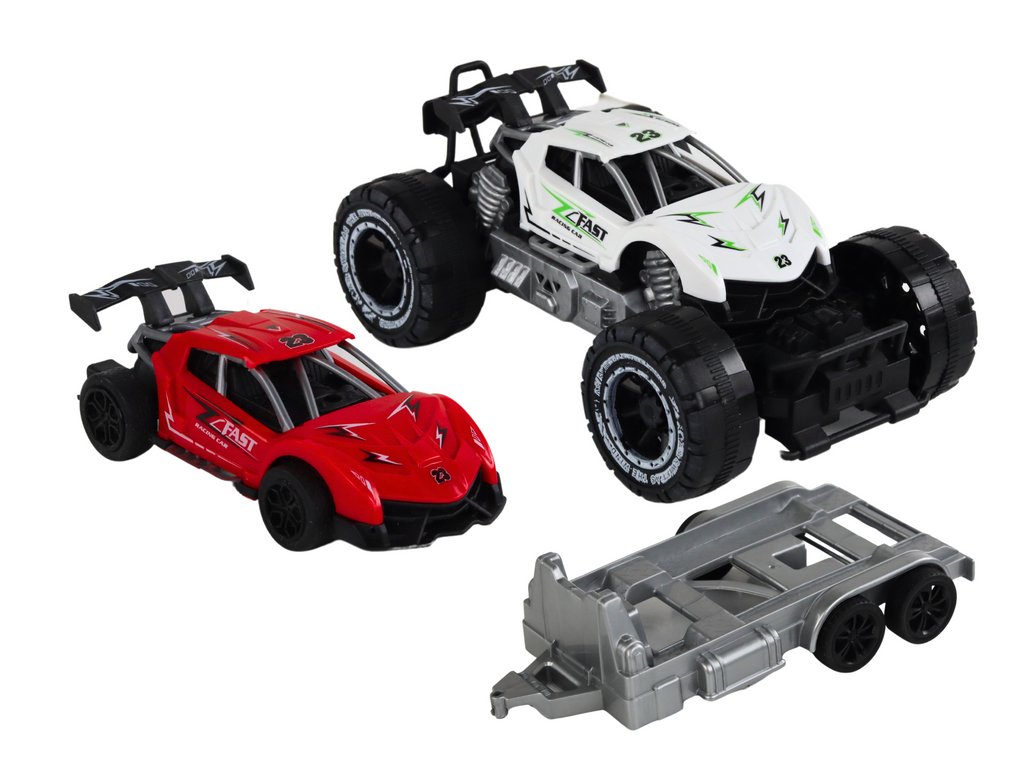 Sada Bílý Terénní Automobil s Přívěsem a Červeným Sportovním Vozem