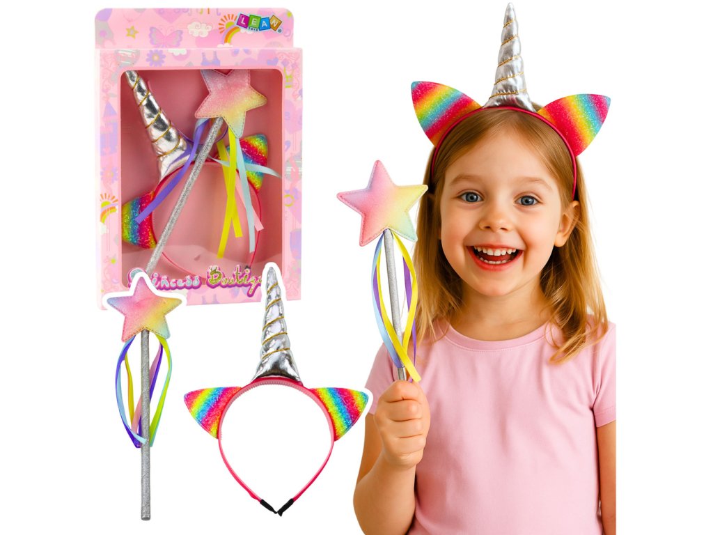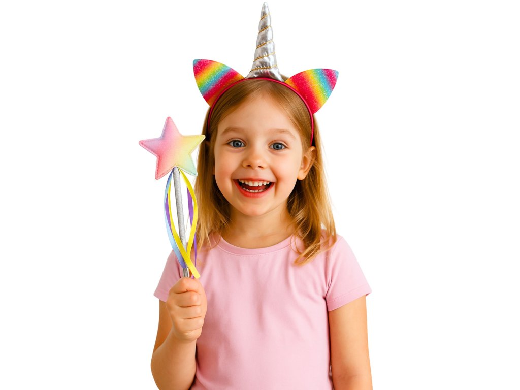 Představujeme Vám kouzelnou sadu doplňků pro malé princezny – ideální volbu pro děti, které milují kreativní hru. Tato sada obsahuje čelenku s rohem jednorožce v nádherných duhových tónech a hůlku ve tvaru hvězdy, zdobenou barevnými stuhami. Intenzivní barvy a třpytivé detaily zajišťují, že tyto doplňky upoutají pozornost každého dítěte. Sada podporuje hrátky na role, rozvíjí představivost, kreativitu a sociální dovednosti. Děti mohou být princeznami, vílami či jednorožci a vytvářet si vlastní pohádkové příběhy. Doplňky jsou lehké, pohodlné a bezpečné, což z nich činí ideální volbu pro každodenní hraní i tematické večírky, karnevaly či vystoupení. Tento produkt je vyroben z kvalitních a odolných materiálů a splňuje bezpečnostní normy.