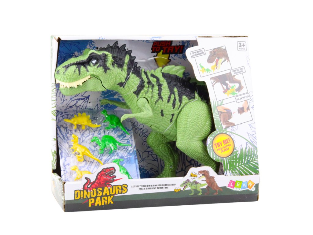 Textura kůže, věrná reprodukce siluety a dynamické zbarvení v odstínech zelené s černými detaily dělají hračku impozantní a přitahují pozornost na první pohled Dítě může vložit do tlamy velké figurky menší dinosaury ze sady a následně je vyjmout speciálním otvorem ve spodní části hračky