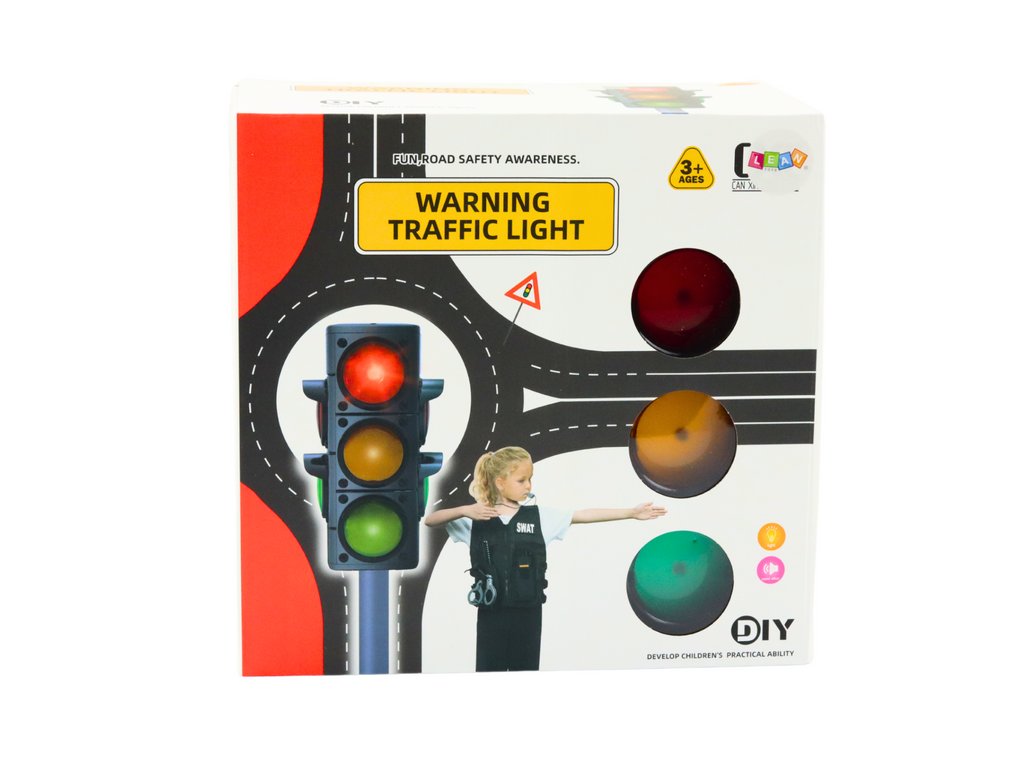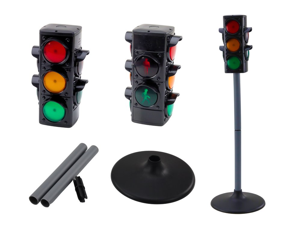 - Světelný signál, který imituje funkci skutečného zařízení pro řízení dopravy, což dětem umožňuje vytvářet různé světelné signály a učit se základní pravidla silničního provozu