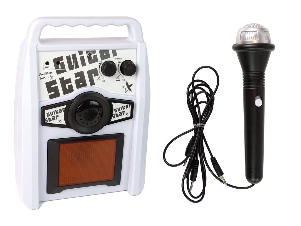 V sadě najdete také bílý reproduktor, který se do sady připojuje a umožňuje šíření zvuku po širším okolí, takže se vaše dítě může cítit jako pravá hudební hvězda. Reproduktor je vybaven rukojetí pro snadné přenášení.