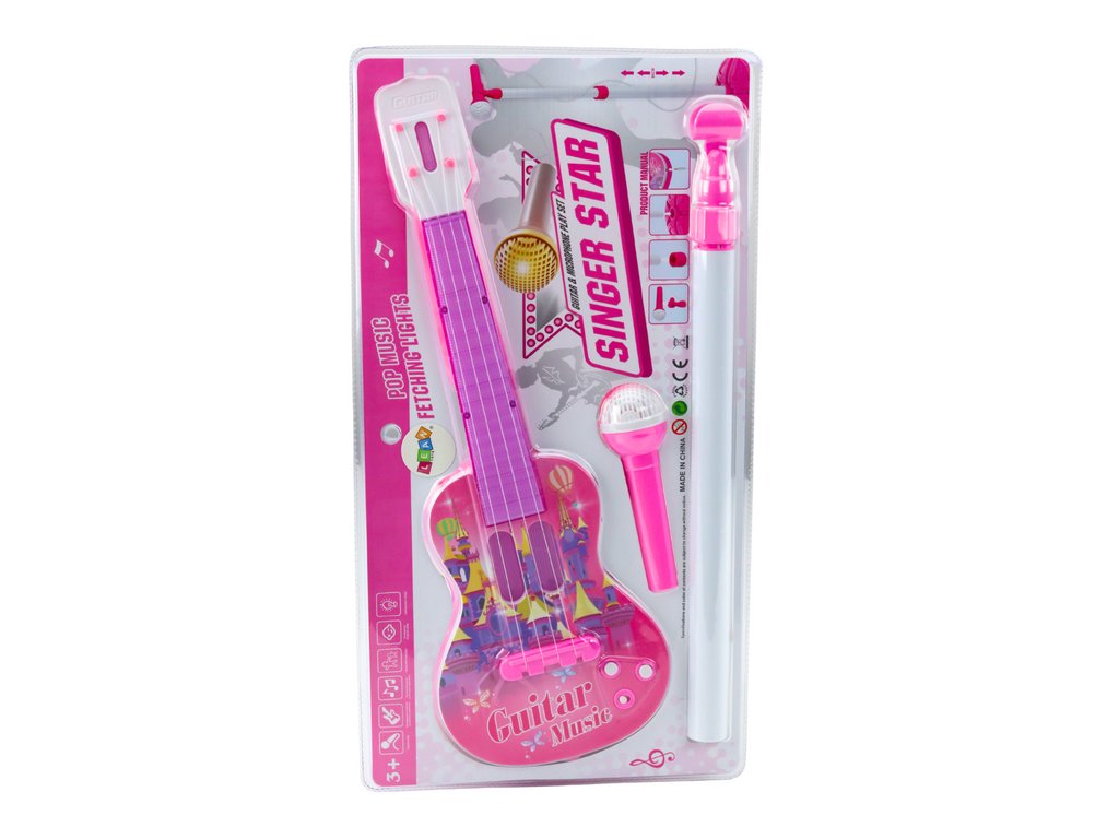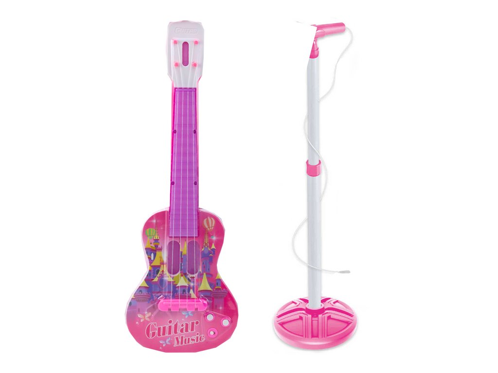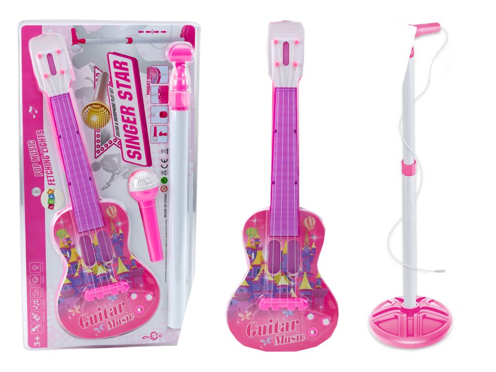 - Elektrická kytara se stojanem a mikrofonem na baterie v růžové barvě představuje spektakulární hračku, která přenese malé děti do kouzelného světa hudby