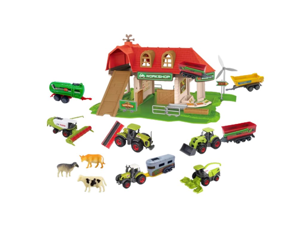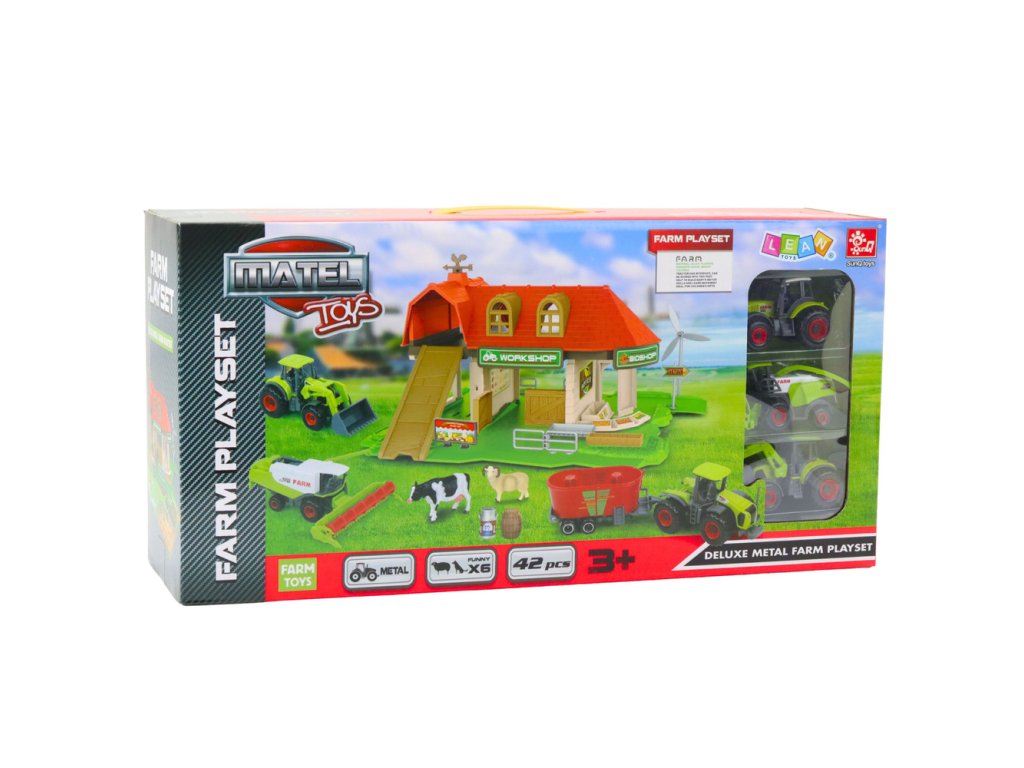 - Set obsahuje všechny nezbytnosti, které malý hospodář potřebuje: stodolu, větrný mlýn, ohrady, traktory s přívěsy a také hospodářská zvířata jako krávy, koně, ovce a kozy