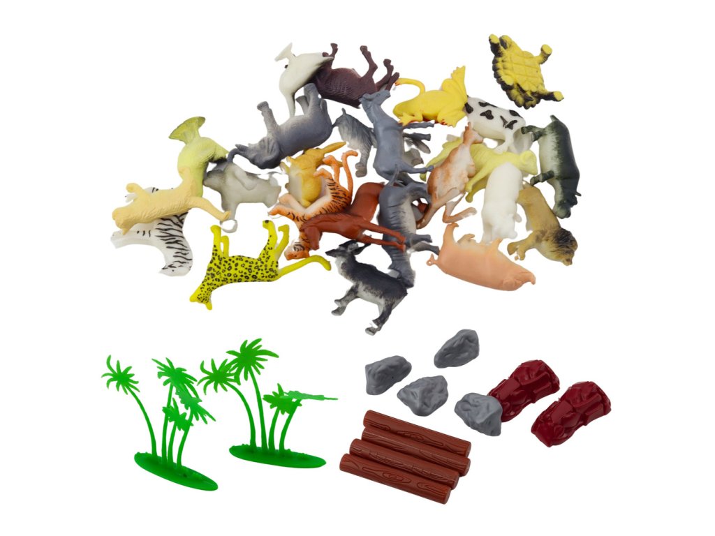 - 44 realistických zvířecích figurek včetně exotických zvířat safari jako žirafa a tygr, a domácích zvířat jako pes a kočka