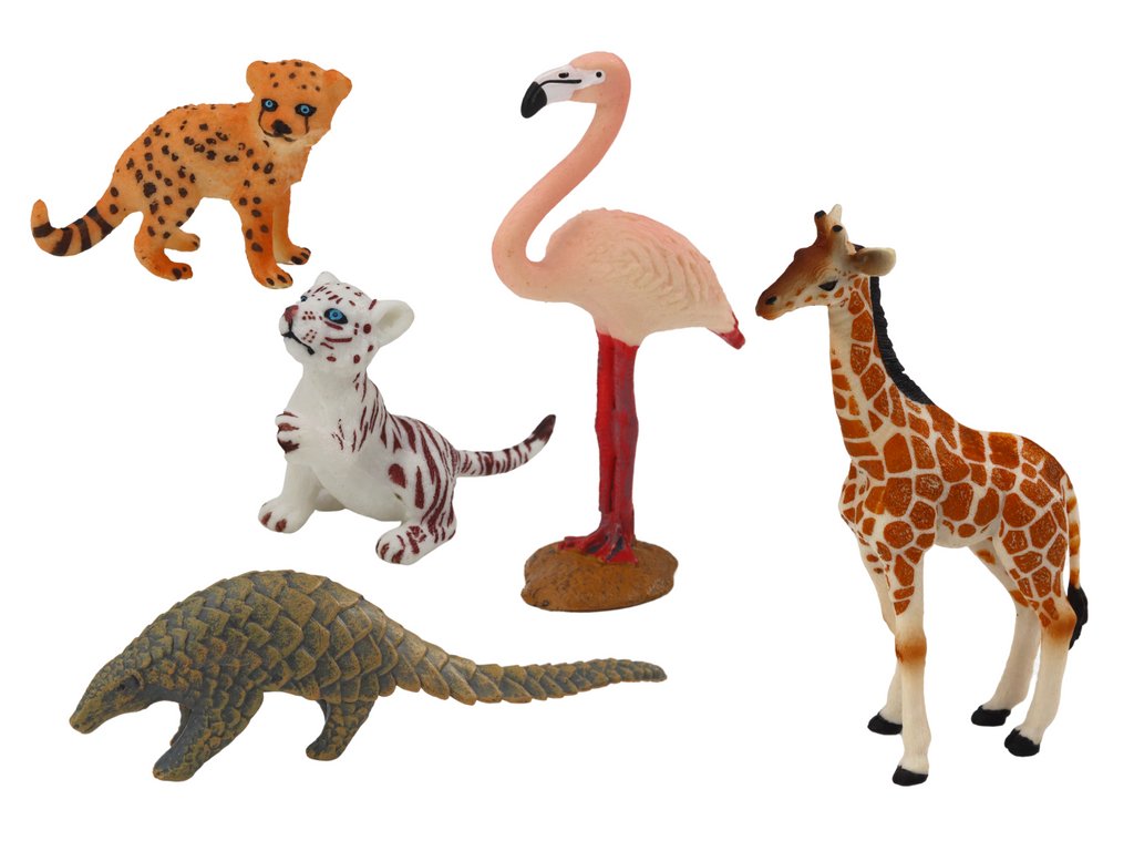 - Roztomilé figurky: žirafa, plameňák, dva tygříci, slon a pangądžín