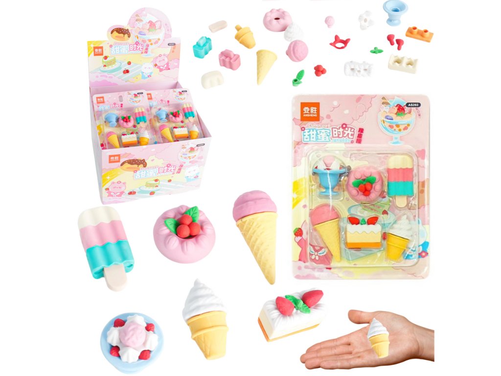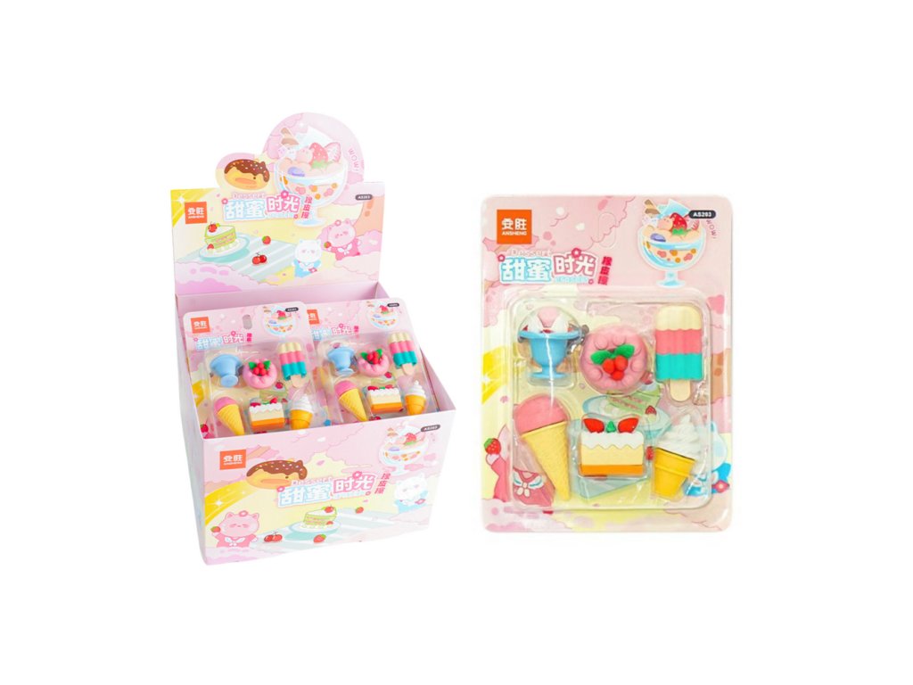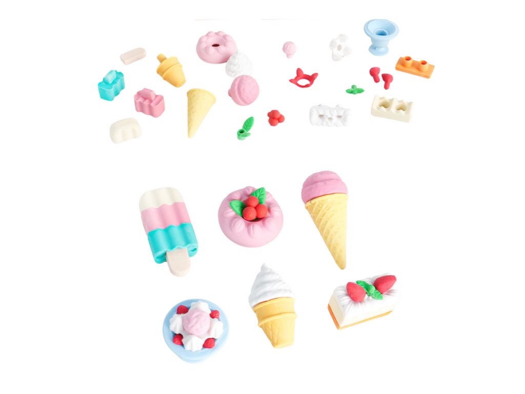V sadě se nacházejí gumy, které připomínají zmrzlinu, cukroví, dezerty a muffiny každá z nich je vyrobena s péčí o detaily a v živých barvách