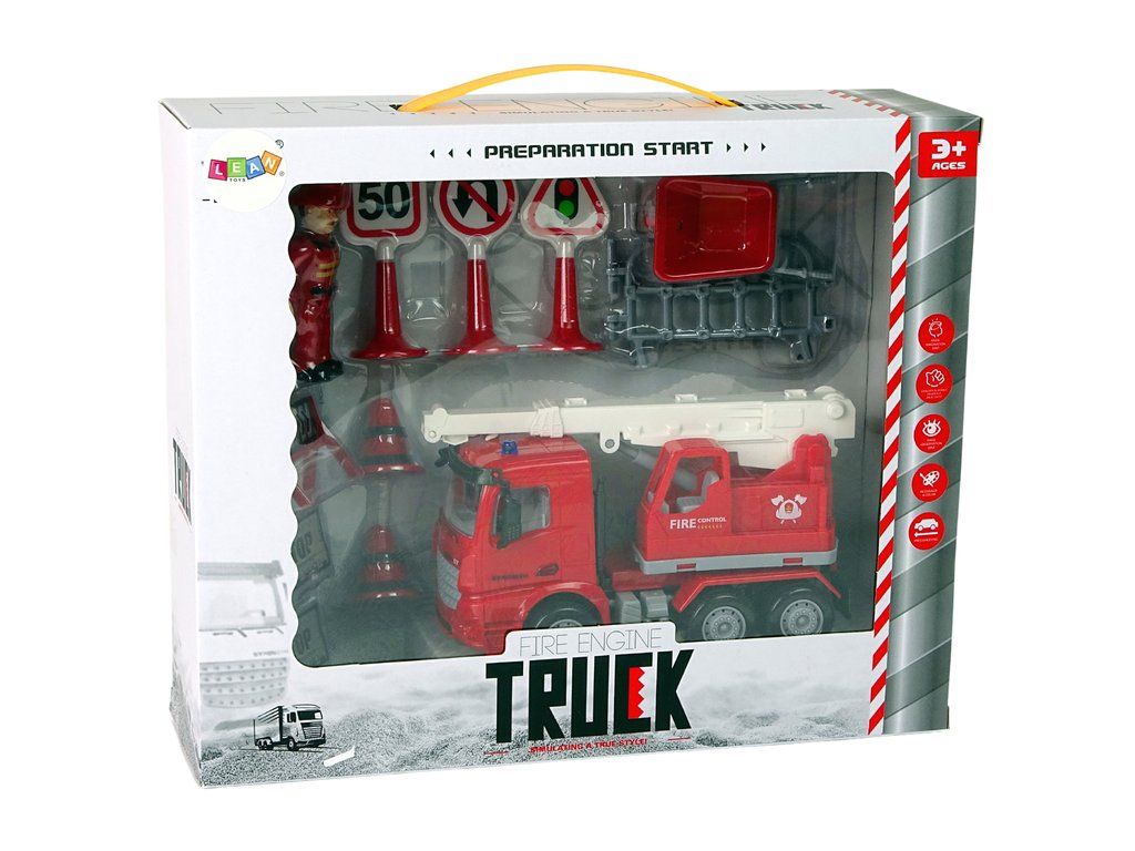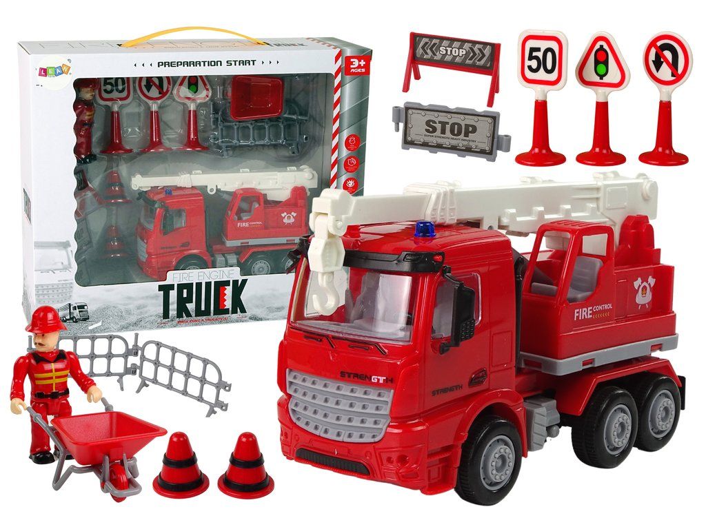 Sada hasičů, jeřáb, dopravní značky, hasič Každý záchranný tým potřebuje dopravní prostředky Všechna vozidla umožní malému hasiči zachraňovat lidi nebo medvídky