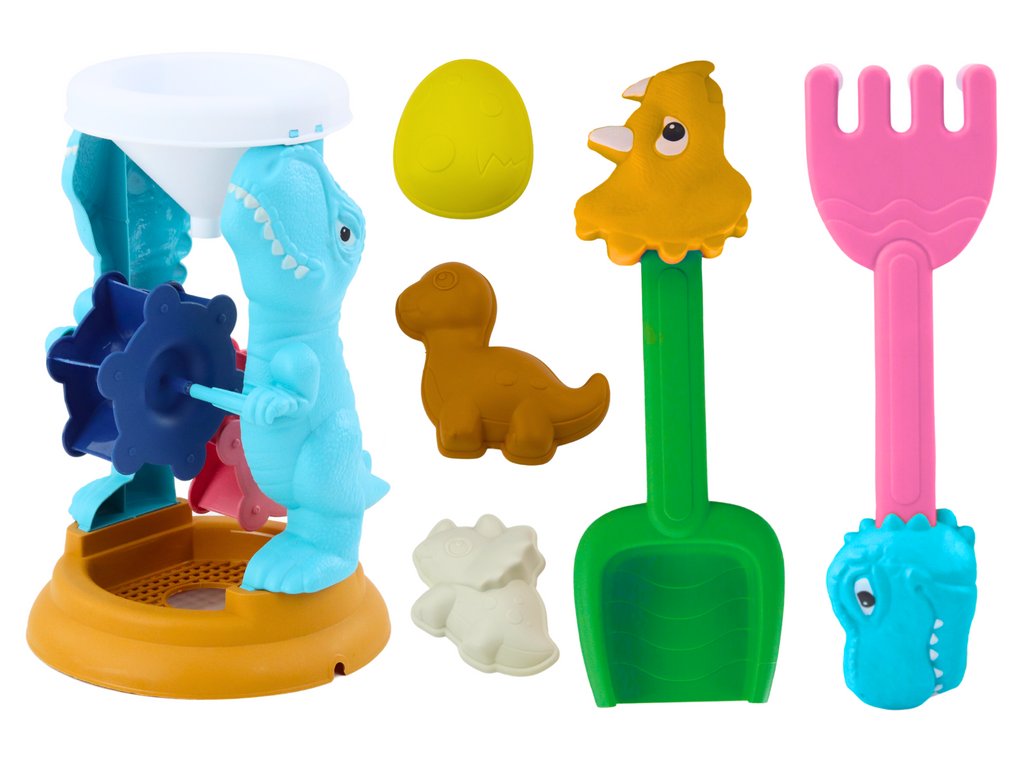 Sada hraček do písku je ideálním způsobem pro kreativní zábavu na pláži nebo na pískovišti Hlavním prvkem sady je mlýnek s motivem dinosaurů, který slouží jako trychtýř a sítko