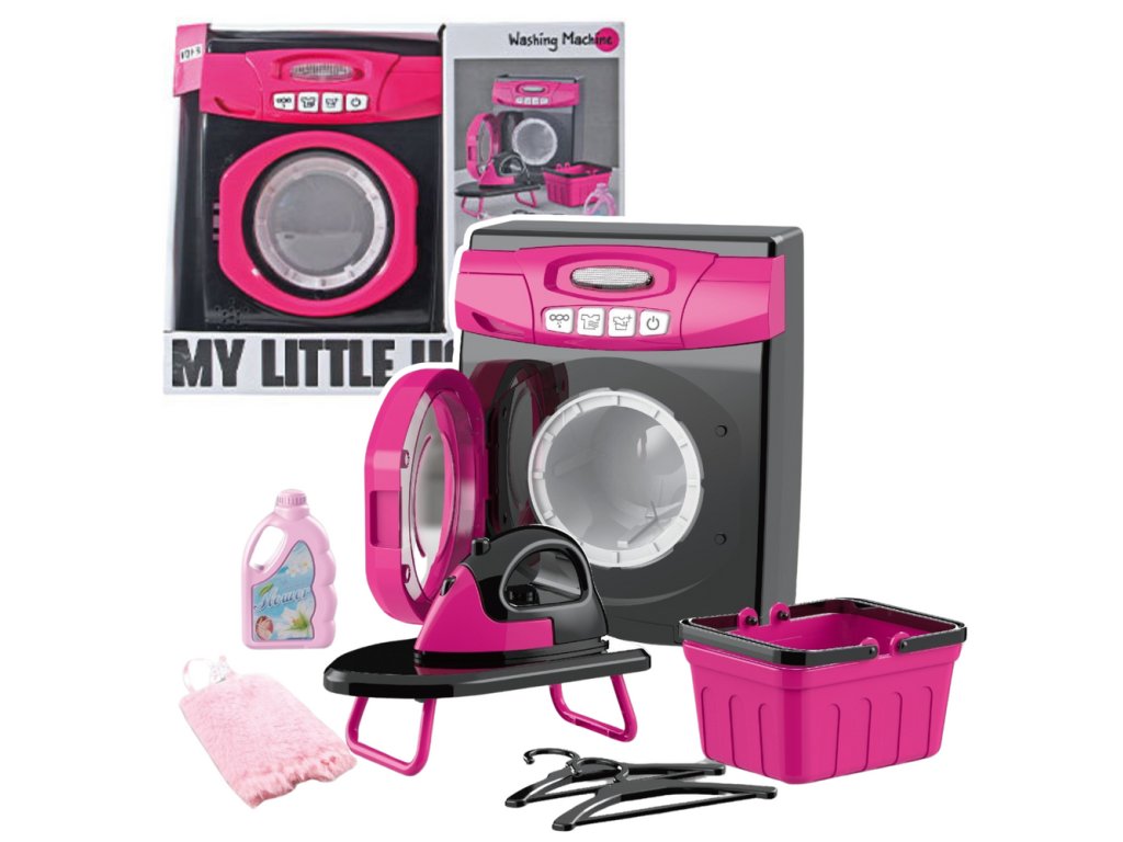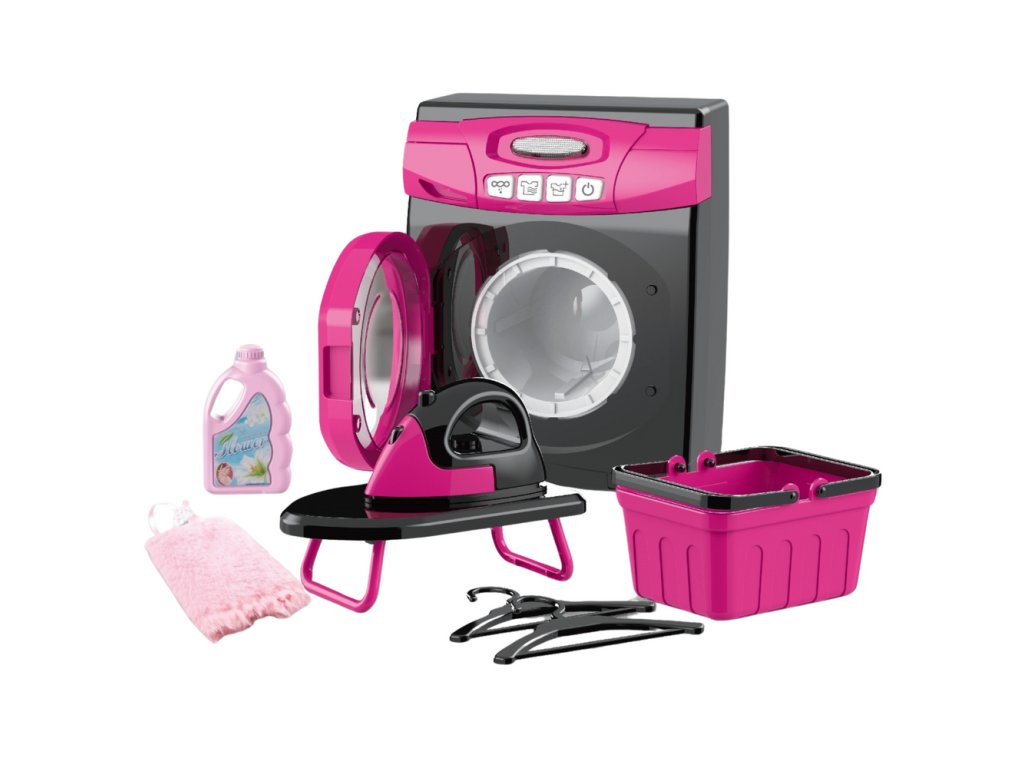 - Součástí sady je realisticky vyrobená hračka pračky s světelnými a zvukovými efekty, a také bohatá sada doplňků: mini žehlička, žehlicí prkno, koš na prádlo, imitace pracího prostředku, dva věšáky a měkké růžové šaty