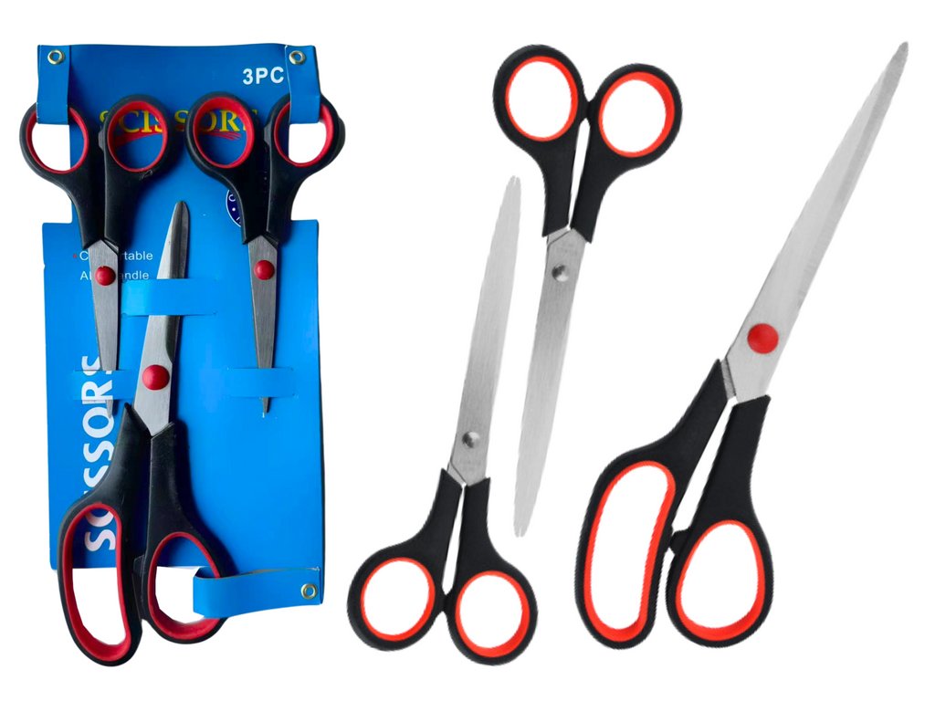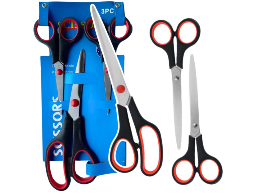 - Zestaw Nożyczek Biurowe Uniwersalne 3szt zawiera tři páry kancelářských nůžek o různých velikostech, které se perfektně hodí pro každodenní použití v domácnosti, kanceláři i dílně