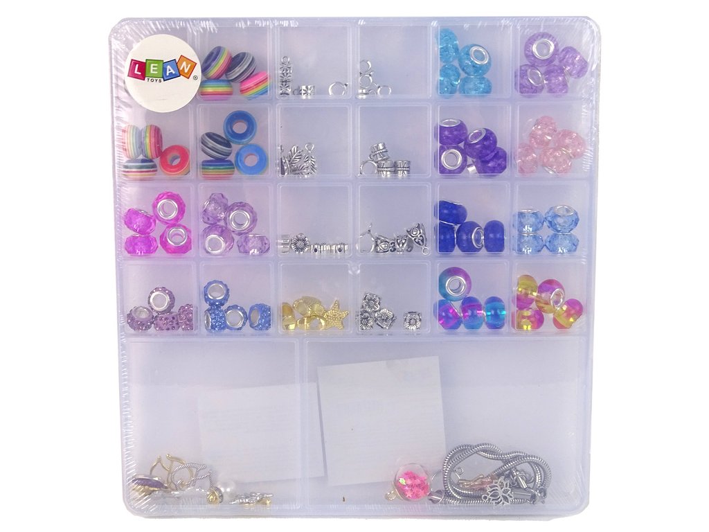 - Sada obsahuje 16 modelů korálků v různých barevných odstínech a různé formy přívěsků jako jsou listy, hvězdice, květiny a srdíčka