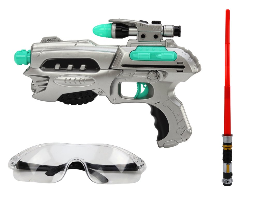 - Tento neobvyklý set obsahuje pistoli, světelný meč a ochranné brýle