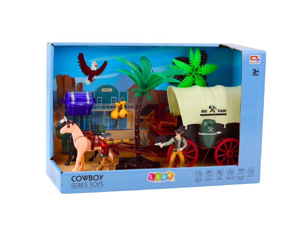 Set kovbojských figurek s vozem westernovým, koňmi a figurkami je ideální volbou pro všechny malé fanoušky Divokého západu a dobrodružství inspirovaných klasickými westerny.