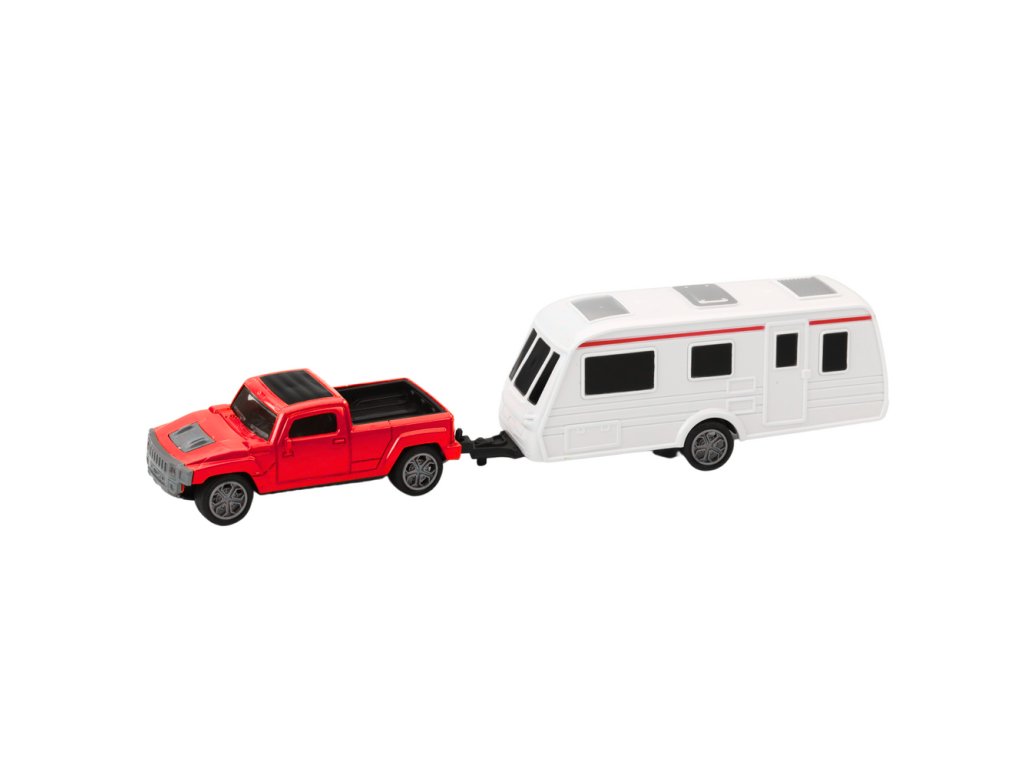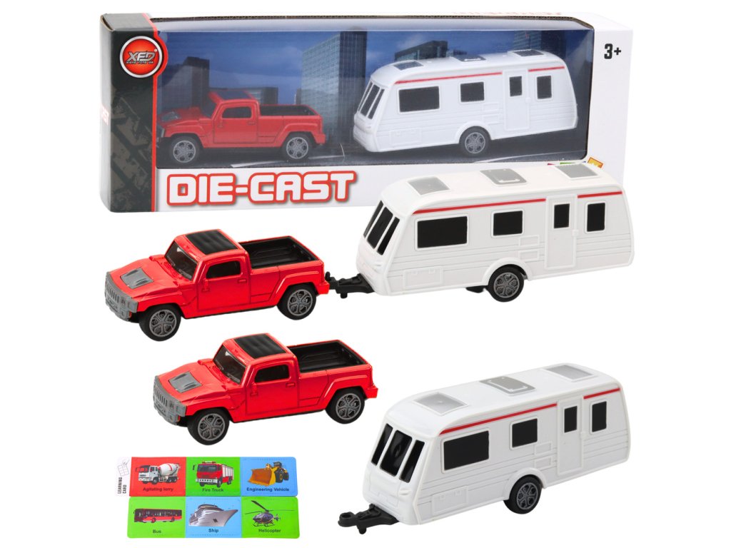 Sada Kovový Auto s Karavanem Přívěs Červený je ideální volbou pro děti, které se zajímají o motorismus, cestování a dobrodružství Červené terénní auto s kovovou karoserií a kempingovým přívěsem tvoří výjimečný komplet, který se vyznačuje realistickým vzhledem a pevnou konstrukcí