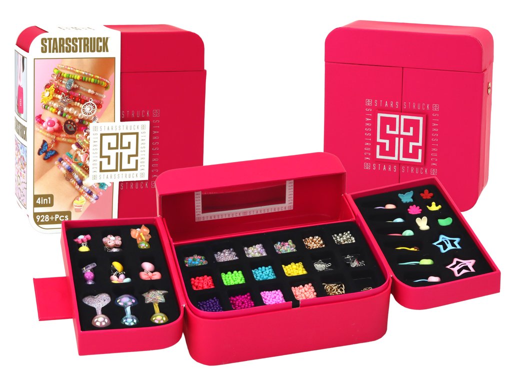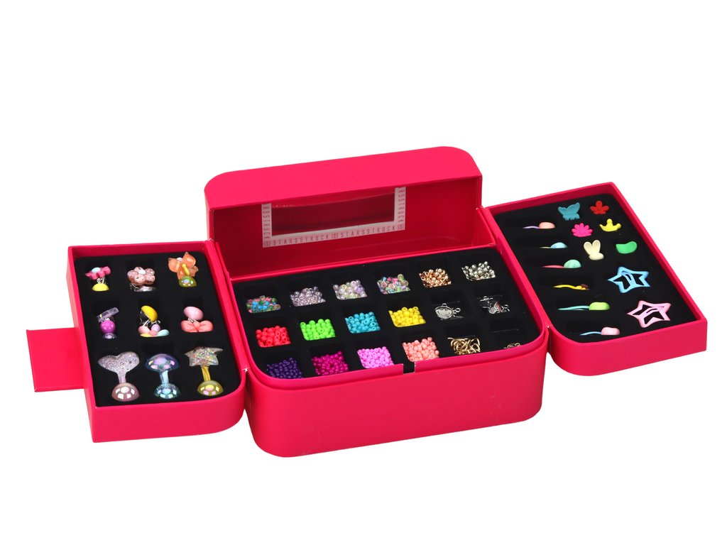 Sada na výrobu šperků v krabičce s přívěsky a sponkami Představujeme vám jedinečnou sadu pro výrobu náramků, zabalenou v elegantní růžové krabičce! Tato kompletní sada obsahuje vše, co vaše dítě potřebuje k vytvoření nespočtu šperků a vyjádření své kreativity
