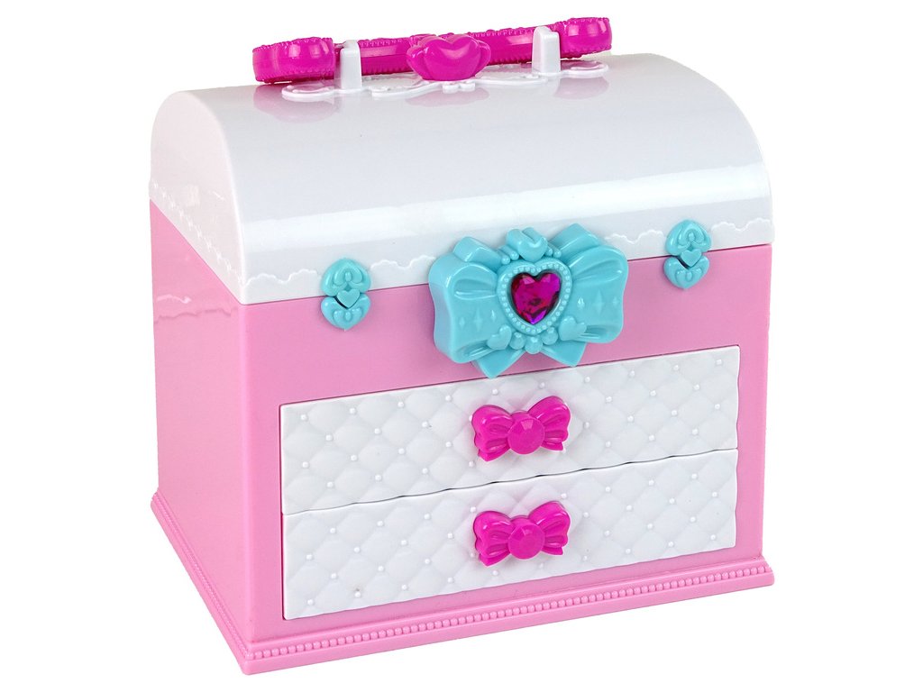 - Kufřík má dvě vysouvací zásuvky, které jsou zdobené jemnou růžovou mašlí, která dodává celému kufříku šarm a dívčí půvab