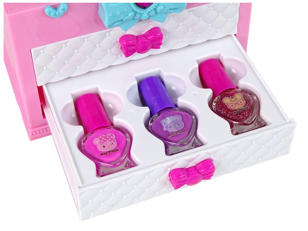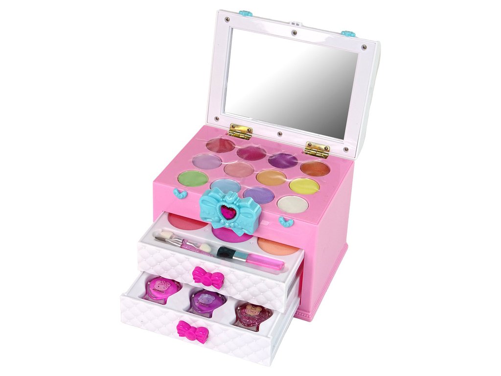 Kufřík má dvě vysouvací zásuvky, které jsou zdobené jemnou růžovou mašlí, která dodává celému kufříku šarm a dívčí půvab V první zásuvce se nacházejí 3 oční stíny a 3 štětečky, které malým umělkyním umožní vytvářet rozmanité líčení a experimentovat s barvami