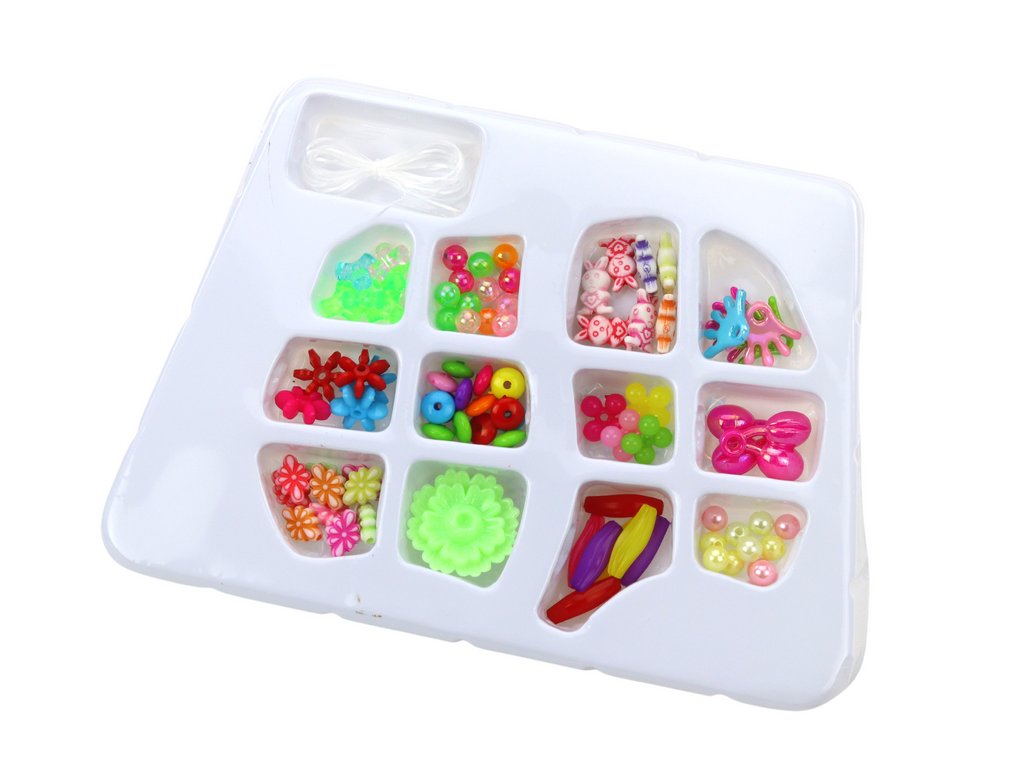 Kreativní sada korálků na výrobu šperků, barevné Sada barevných plastových korálků je neobvyklá nabídka pro malé milovnice šperků a ručních prací Díky rozmanitosti tvarů, velikostí a barev může každá holčička popustit uzdu své fantazii a vytvořit jedinečné šperky