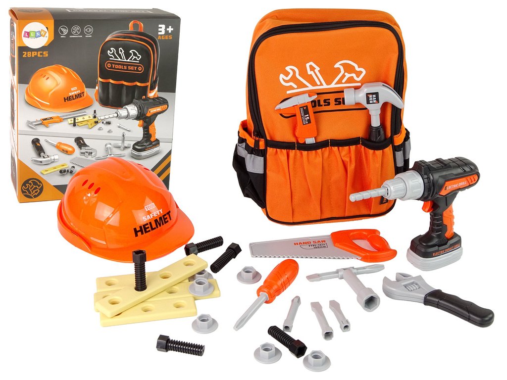 - Sada pro kutily v batohu s helmou a nářadím, oranžová Velká sada v batohu, kterou si můžete vzít s sebou kamkoli na každou dětskou stavbu