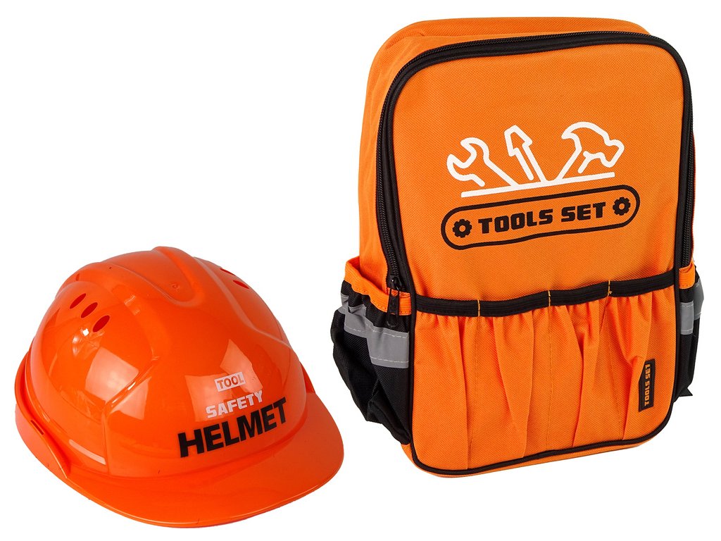 Sada pro kutily v batohu s helmou a nářadím, oranžová Velká sada v batohu, kterou si můžete vzít s sebou kamkoli na každou dětskou stavbu Skvělé příslušenství pro malého stavitele